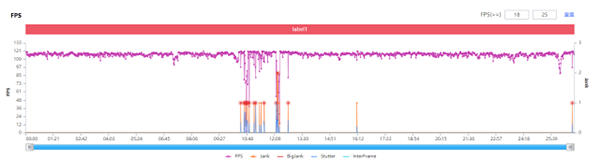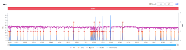 第一局游戲的Drop值為0,Jank值為0.6。第二局游戲的Drop值為0,Jank值為0。觀察幀率曲線,非常的平穩(wěn)。