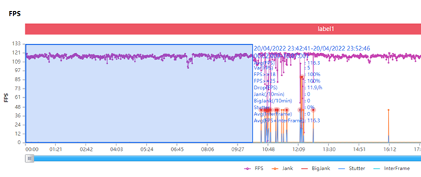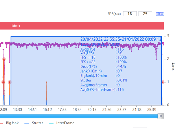 首先看一下幀率、畫質(zhì)拉滿的王者榮耀的幀率情況。排除兩局間大廳頁面,第一局游戲的Drop值為11.8,Jank值為0,平均幀率為116.4。