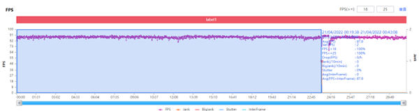 在一加Ace的發(fā)布會上,Louis用和平精英游戲舉例,展現(xiàn)非常流暢的游戲效果,讓筆者印象深刻。經(jīng)過實測,在流暢畫質(zhì)90幀的圖像設置下,一加Ace和平精英實際對局間游戲的Jank值和Drop值均為0,平均幀率為87.9,就是0卡頓。