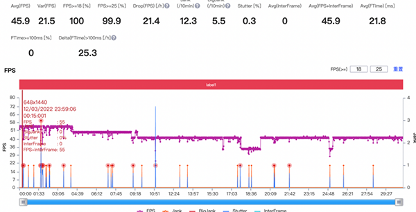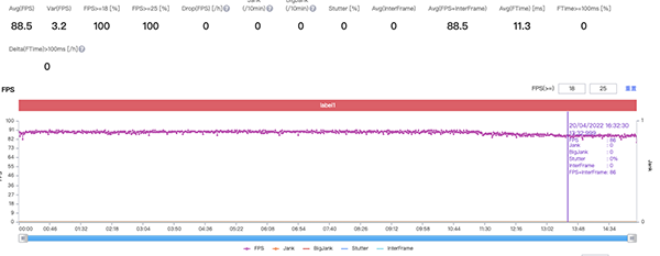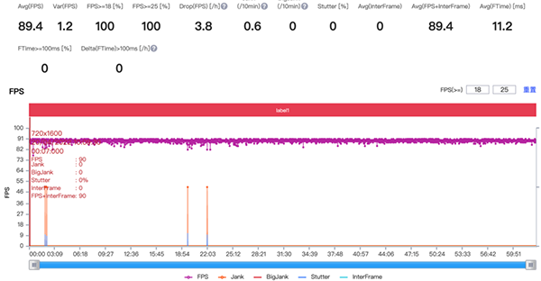 一般來說,當(dāng)游戲出現(xiàn)卡頓情況時,幀率數(shù)據(jù)也會呈現(xiàn)大幅度的波動,相鄰兩FPS間幀率差大于8幀,而那個大幅度波動的瞬間就是“掉幀”?!暗魩睍屚婕颐黠@感覺到卡頓了一下,掉幀次數(shù)(Drop值)越大,卡頓次數(shù)越多,游戲運(yùn)行效果越差,相反則是游戲運(yùn)行更加流暢。在科技美學(xué)的測試中,一加Ace在《和平精英》在流暢/90幀模式下,一小時測試后Drop值為3.8,而另外一款驍龍8設(shè)備的Drop值為21.4,雖然兩者平均幀率都是89.4,但是一加Ace顯然流暢許多。