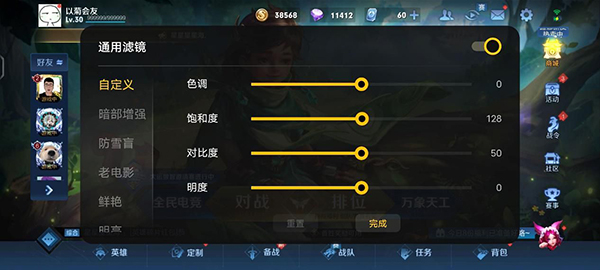 在打開游戲視效增強后,用戶可以自行調(diào)節(jié)游戲內(nèi)的色調(diào)、飽和度、對比度、明度等選項,同時還有老電影、鮮艷等多種預(yù)設(shè)模式可供選擇,充分滿足了用戶對于各種游戲畫面的需求。