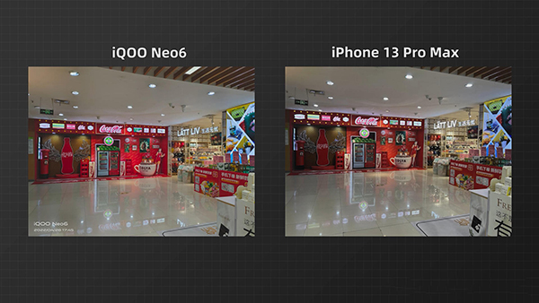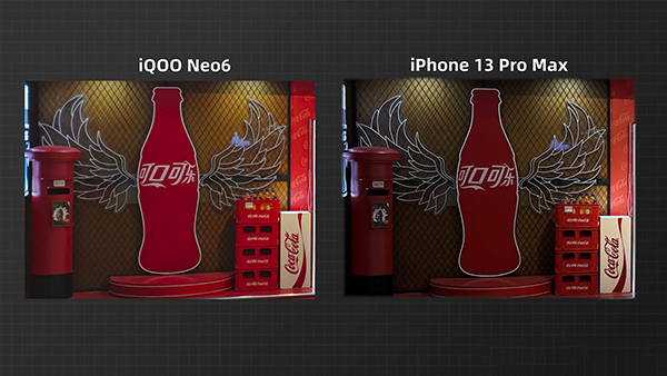 在光線復(fù)雜的環(huán)境下,不同色彩的光源也沒有互相干擾,白色燈板沒有出現(xiàn)過曝的情況,細(xì)節(jié)展現(xiàn)和iPhone有得一拼,可見vivo的影像算法還是有些功底的。