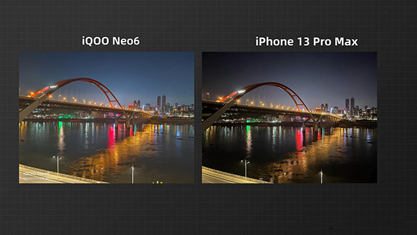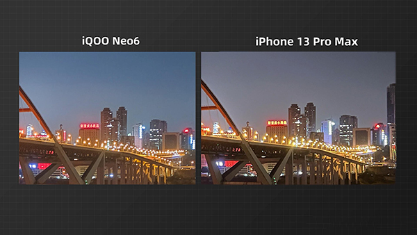 至于夜景,iQOO依然是拉高了飽和度,觀感討好眼球,不過看細(xì)節(jié),算法痕跡比較重,涂抹感有些明顯。