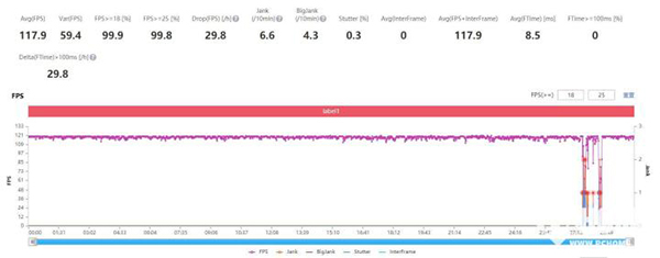實際游戲的性能釋放上,我們使用騰訊PerfDog來對游戲數(shù)據(jù)進行全程監(jiān)控,王者榮耀50%屏幕亮度高清畫質(zhì)30分鐘平均幀率117.9幀,拋開加載畫面,全程沒有幀率大波動。游戲全程手機表面溫度不熱,30分鐘游戲正面最高溫度41.3度,背面最高溫度38.8度,平均功耗4.24W,耗電量13%,做到了流暢、不熱、省電全都要的體驗。