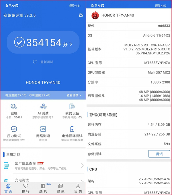 性能方面,榮耀Play6T Pro采用天機(jī)810處理器,該款處理器采用6nm工藝,支持5G網(wǎng)絡(luò),并且支持5G雙待機(jī),就是2張卡可以同時(shí)5G網(wǎng)絡(luò)待機(jī)。機(jī)身存儲(chǔ)方面,256GB大空間,用戶可用的空間接近220G,足夠大,再也不用擔(dān)心照片和視頻太多放不下了。我們用安兔兔測(cè)試了一下跑分,跑分35萬(wàn)多,整體的性能還是不錯(cuò)的。