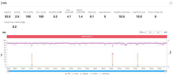上手測試了半小時畫質(zhì)幀率拉滿的《王者榮耀》,發(fā)現(xiàn)這款手機的游戲體驗非常不錯,無論是前中期的帶線推塔、刷野拿龍等平穩(wěn)發(fā)育,還是中后期的團戰(zhàn)、壓高地等環(huán)節(jié),游戲畫面都顯得平穩(wěn)流暢,沒有絲毫卡頓出現(xiàn)。在幀率測試軟件也能看出OPPO K10 Pro的幀率過度非常平穩(wěn),基本維持在92.6幀左右。