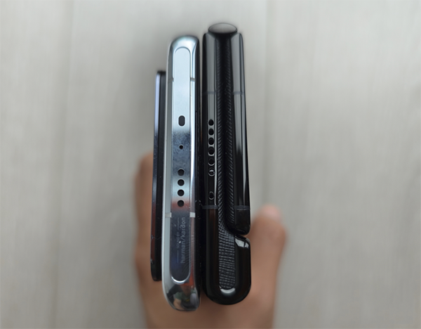 在展開后,其厚度要遠(yuǎn)小于普通直板手機(jī),通過對(duì)比能夠看到,即使在折疊狀態(tài)下,華為Mate Xs2的厚度也沒有明顯大于直板旗艦手機(jī),甚至如果算上很多旗艦直板手機(jī)都有的較厚鏡頭模組,那么兩者的整機(jī)厚度的確可以說是“不相上下”。