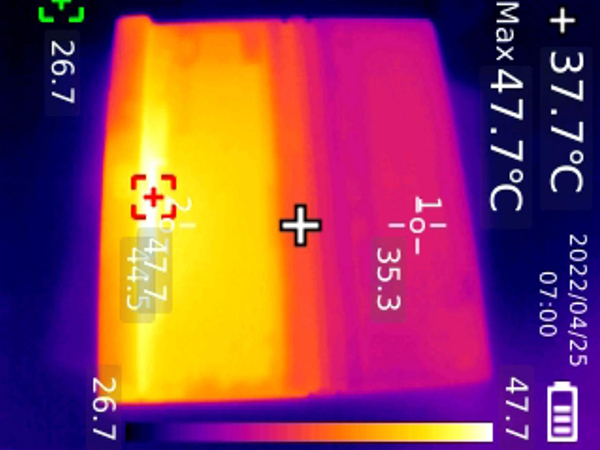 在測(cè)試壓力最大的《原神》游戲中,手機(jī)的熱量全部集中與上半側(cè)機(jī)身(因?yàn)榇藭r(shí)手機(jī)是橫向上下展開使用),溫度最高可以達(dá)到47.5℃,而下半身雙手握持的區(qū)域依然僅有35.3℃,可以說(shuō)游戲時(shí)可以擁有極其涼爽的使用體驗(yàn)。