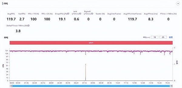 在出色的硬件實(shí)力的支撐下,iQOO Neo6 SE可以實(shí)現(xiàn)滿幀級(jí)別的幀率表現(xiàn)。在《王者榮耀》120幀模式下,iQOO Neo6 SE的15分鐘平均幀率為119.7幀,游戲全程幀率表現(xiàn)非常穩(wěn)定,沒(méi)有出現(xiàn)明顯掉幀的情況,即使是團(tuán)戰(zhàn)時(shí)的幀率也十分穩(wěn)定。