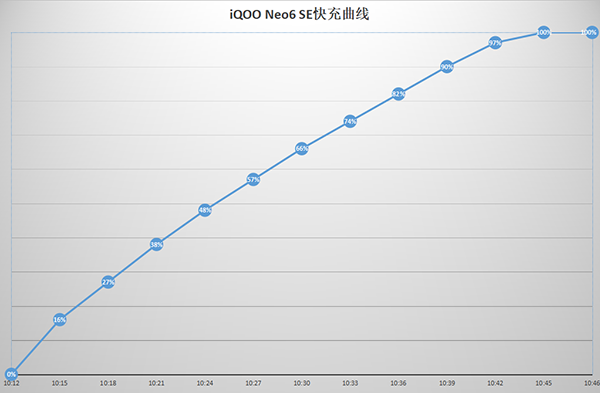 快充方面,這次iQOO Neo6 SE采用的是80W快充方面,結(jié)合電池應該是雙電芯快充。雖然沒有下放120W快充顯得比較可惜,但實際上iQOO Neo6 SE的80W快充效率也不慢,從0%電量(關(guān)機狀態(tài))充電至100%耗時34分鐘,其中涓流充電的時間顯得特別短,但此時電流計顯示的電流確實已經(jīng)接近為零了。