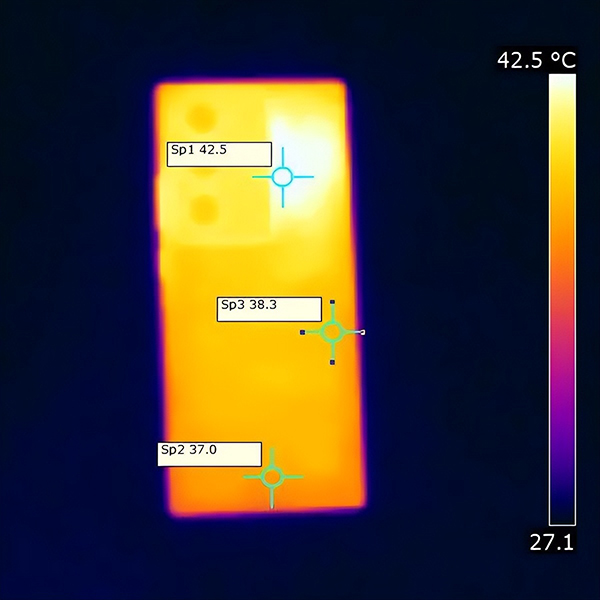 在散熱方面,我們實(shí)測了在26℃的室內(nèi)環(huán)境中運(yùn)行最高畫質(zhì)《原神》30分鐘,測得機(jī)身最高溫度為42.5℃,位于攝像頭附近,在握持時(shí)稍有發(fā)熱。不錯(cuò)的散熱能力自然離不開Axon40 Ultra全新采用的九層散熱架構(gòu),不僅在機(jī)身內(nèi)設(shè)計(jì)了雙通路增強(qiáng)VC液冷均溫板,還進(jìn)行了快速傳導(dǎo)設(shè)計(jì),對核心熱源的傳導(dǎo)能力大大提高。