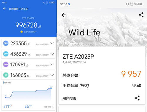 不過要想了解驍龍8芯片真實(shí)的性能表現(xiàn),還是要看實(shí)際的跑分成績。中興Axon40 Ultra在安兔兔中的綜合跑分成績?yōu)?96728分,作為一款綜合旗艦手機(jī)這已經(jīng)是非常出色的成績了,可以流暢運(yùn)行各類大型游戲和復(fù)雜任務(wù)。這一點(diǎn)在另一款軟件——3DMark中也得到了進(jìn)一步的印證,中興Axon40 Ultra在WildLife模式下的跑分為9957分。