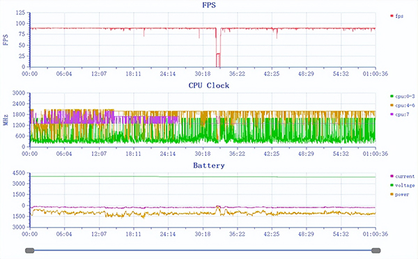在《和平精英》的測試項目中,vivo X80 Pro天璣9000版幾乎是毫無壓力地以接近滿幀的表現(xiàn)運行游戲,《和平精英》在1小時的游戲時間里取得了89.35fps的平均成績。從幀率曲線來看除了游戲結(jié)束對局回到大廳(讀條和大廳都有幀率限制)后出現(xiàn)了一些波動,其余時間基本都保持在90fps水準。