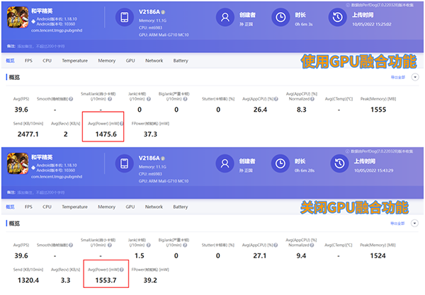 再看功耗,筆者在新的對(duì)局中,使用GPU融合功能和未使用GPU融合功能兩種狀態(tài)下分別進(jìn)行了大約6分鐘的《和平精英》,可以看到,在打開GPU融合功能的情況下,手機(jī)整體的功耗的確表現(xiàn)更優(yōu)。而且在游戲測(cè)試后期小編關(guān)閉GPU融合功能后,由于生存信號(hào)區(qū)范圍縮小,小編的行動(dòng)范圍受限,理論上功耗要比游戲前期更低,但是由于游戲前期GPU融合功能開啟,結(jié)果卻是前期四處跑圖時(shí)功耗低,可見GPU融合的效果還是比較明顯的。