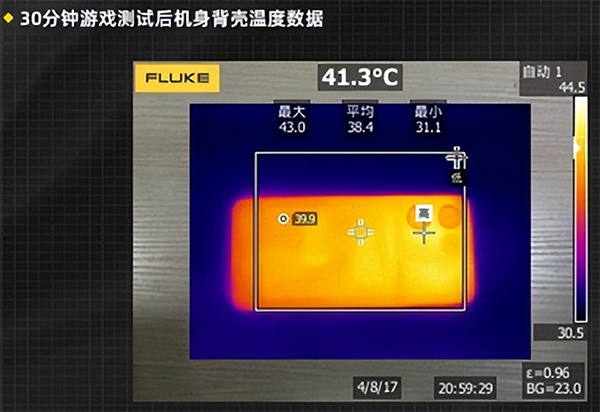 在前面游戲測試的過程中,我們還對一加Ace競速版的機身后蓋溫度進行了測試。經(jīng)測量,在經(jīng)過30分鐘高強度的游戲?qū)崪y之后,一加Ace競速版的機身后蓋平均溫度為41.3攝氏度,單點峰值溫度為43攝氏度。