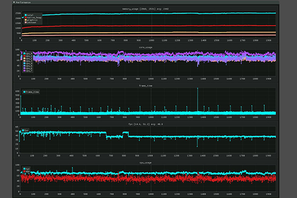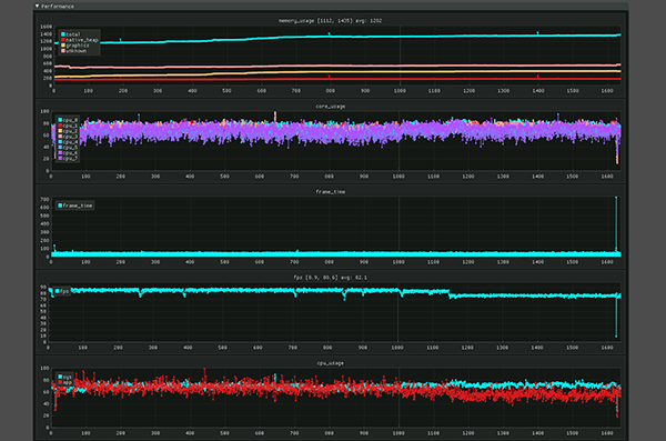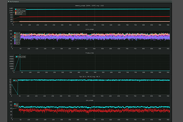 競速類游戲《QQ飛車》中,游戲過程中的平均幀率在90fps左右(中間幾段波動是游戲結(jié)束及等待界面)。