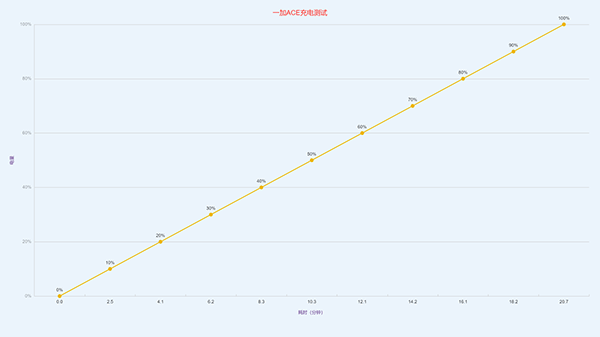 經(jīng)過我的測試,一加ACE從0到100所用時(shí)間在20分鐘左右。這和一加宣稱的17分鐘充電時(shí)間有點(diǎn)出入,但要說明的是,我是在手機(jī)徹底用完電并關(guān)機(jī)的情況下才連接充電器,手機(jī)有一段開機(jī)過程,并且為了計(jì)時(shí)方便,一直開啟息屏顯示,而且Wi-Fi、藍(lán)牙等連接都正常開啟。所以,在我看來,一加ACE的充電速度已經(jīng)足夠快了,很好的緩解了我對手機(jī)的用電焦慮。