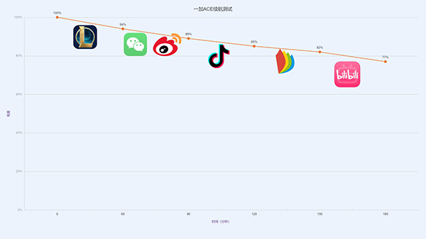 手機(jī)充電要快,而在另一方面,還要用的持久。一加ACE配備的是一塊4500mAh的大電池,為了測試其續(xù)航表現(xiàn),我簡單模擬了日常的使用習(xí)慣。在調(diào)整亮度和音量都在50%的情況下,1小時(shí)《英雄聯(lián)盟》耗電6%,30分鐘微信、微博耗電5%,半小時(shí)抖音耗電4%,半小時(shí)掌閱耗電3%,最后半小時(shí)B站(1080P畫質(zhì))耗電5%,最終剩余77%的電量。