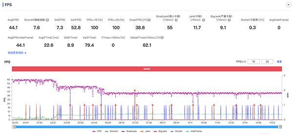 如下圖所示,在15分鐘左右的《原神》游戲中,vivo S15的平均幀率為44.1,穩(wěn)幀指數(shù)為7.6,穩(wěn)幀指數(shù)指游戲時的畫面平穩(wěn)程度,該數(shù)值越小代表游戲越穩(wěn)定,Perfdog官方給出的數(shù)據(jù),一般游戲、視頻建議小于8。