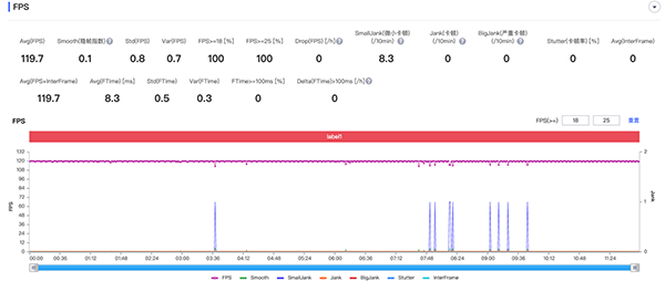 在實測中,vivo S15的一局(12分鐘)平均幀率為119.7FPS,穩(wěn)幀指數(shù)僅為0.1(越小越好)。