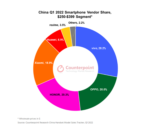 根據(jù)CounterpointResearch的中國手機銷量跟蹤報告,在中國智能手機市場250美元-399美元(約1697元-2709元,批發(fā)價)位段,vivo在第一季度以28.2%的份額領(lǐng)先,在該價位段的145款機型中,vivo的S12名列前茅,占總銷量的近9%。