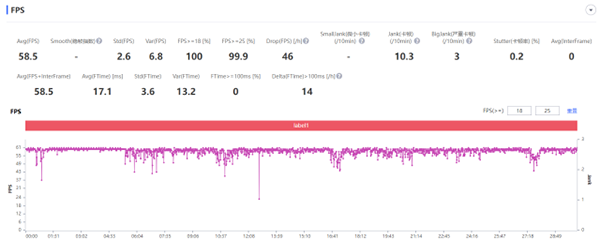 除了《王者榮耀》外,《原神》的幀率表現(xiàn)也讓人驚喜。游戲前15分鐘我們在城鎮(zhèn)瞎逛,游戲后15分鐘我們到野外打怪,在全高畫質下游玩30分鐘之后,平均幀率為58.5幀。vivo S15的成績算是非常不錯的,游戲前五分鐘幀率基本呈一條直線,后面出現(xiàn)輕微波動,但整體還是能處于較高的幀率水平,25分鐘后在野外不斷打怪,也導致負荷增加,出現(xiàn)了幀率下降的情況,但也只有短暫的半分鐘,影響不大。