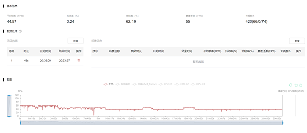 在《原神》中,vivo S15的表現(xiàn)就要“分段”討論了。在游戲開始前幾分鐘,它的運(yùn)行狀況還是非常流暢的,在60幀的上限左右波動著;隨后來到第二個階段,手機(jī)溫度升高了一部分之后,幀率開始下降,鎖在了50幀左右;差不多10分鐘后,它就進(jìn)入了第三個階段,鎖定在40幀左右,偶爾會回升到50,直到半小時的測試結(jié)束。
