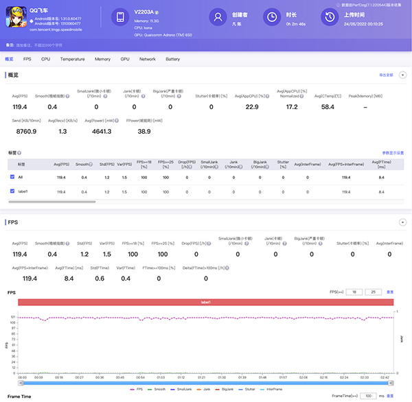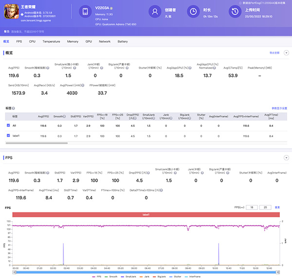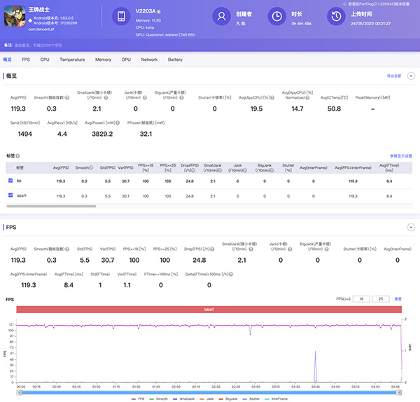 我們直接來看看vivo S15的游戲體驗(yàn),畢竟實(shí)操更加重要,我們先來測(cè)試下幾款主流高幀率游戲,《王者榮耀》室溫27℃,平均幀率達(dá)到了119.6fps,不是特別大范圍團(tuán)戰(zhàn)的情況下,基本不會(huì)出現(xiàn)明顯掉幀。
