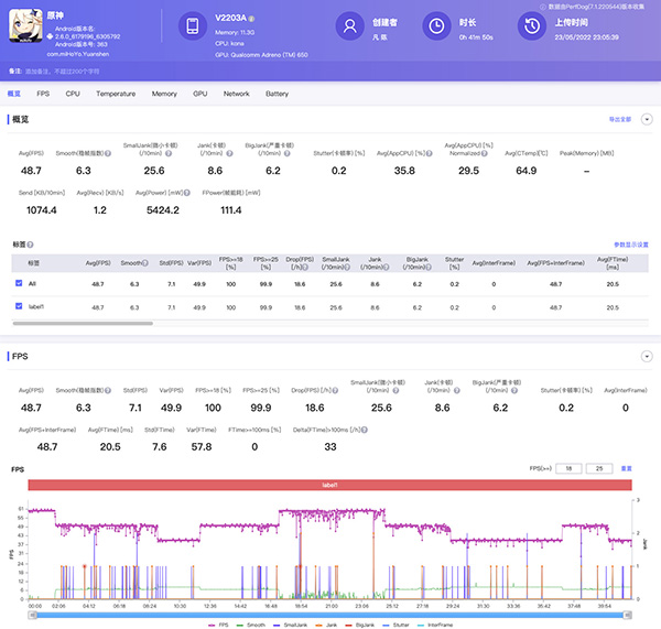測(cè)試《QQ飛車》測(cè)試的競(jìng)速模式,我們?cè)O(shè)置至最高,平均幀率達(dá)到119.4fps,測(cè)試《王牌戰(zhàn)士》平均幀率119.3fps,三款主流游戲幀率相當(dāng)穩(wěn)定。最后,再來測(cè)試最近很火熱的游戲《原神》,設(shè)置最高畫質(zhì)+60幀模式下滿幀運(yùn)行,40分鐘游戲,室溫27℃,vivo S15平均幀率48.7FPS,發(fā)熱的時(shí)候會(huì)進(jìn)行鎖幀,鎖在50和40FPS,這樣就不會(huì)有明顯的卡頓感和發(fā)熱,圖三可以發(fā)現(xiàn)鎖幀之后都是小幅度的波動(dòng)。