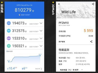可以看出,搭載天璣8100-MAX處理器的OPPO Reno8 Pro+安兔兔跑分成績?yōu)?10279分;3D Mark分?jǐn)?shù)為5595分。整體表現(xiàn)達(dá)到了同價(jià)位應(yīng)有的水準(zhǔn),能夠很好地滿足日常使用乃至于大型手游運(yùn)行等需求。