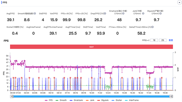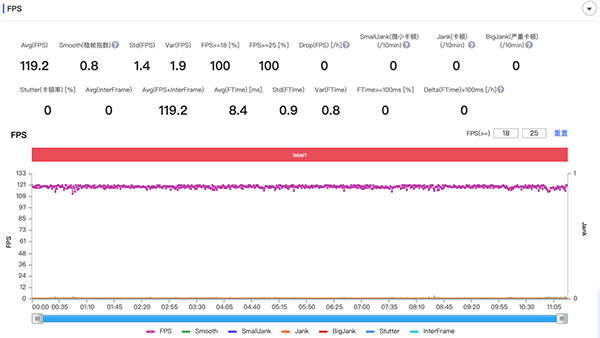 如上圖所示,在一局(11分鐘)王者榮耀游戲中,OPPO Reno8 Pro+平均幀率為119.2,穩(wěn)幀指數(shù)僅為0.8(越小越好)。Drop為0(越小越好)。