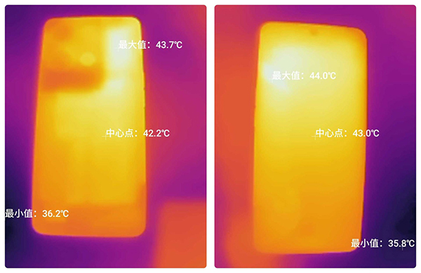 溫度方面,也不用太過擔(dān)心。實測最高溫為43°C,發(fā)熱,但不算“燙手”。