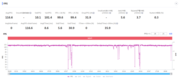 第一款要測(cè)試的是開啟了120幀的《王者榮耀》。作為目前少數(shù)能開啟120幀《王者榮耀》的機(jī)型,OPPO Reno8 Pro+在30分鐘內(nèi)的游戲幀率走勢(shì)相當(dāng)?shù)钠椒€(wěn),除進(jìn)出游戲造成的幀率波動(dòng)外,幾乎是全程保持著滿幀運(yùn)行,平均幀率達(dá)到了116.6fps。