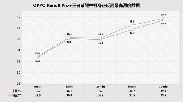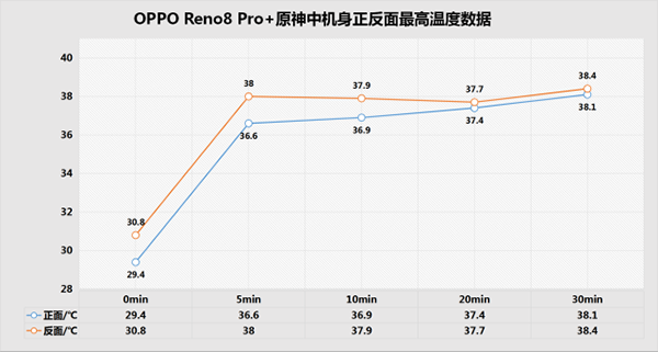 從《原神》六點(diǎn)機(jī)身正反面最高溫度數(shù)據(jù)中,我們找到了答案??梢钥闯?,在0-5分鐘,OPPO Reno8 Pro+機(jī)身溫度升幅最為顯著。而在后續(xù)時(shí)間,直至測(cè)試結(jié)束的第30分鐘,機(jī)身最高溫度其實(shí)也不高,僅38.4℃。由此猜測(cè),OPPO Reno8 Pro+在《原神》測(cè)試的第5-10分鐘內(nèi),機(jī)身整體達(dá)到了峰值溫度,觸發(fā)了溫度閾值。所以在后續(xù)時(shí)間中,OPPO Reno8 Pro+的便采取了降幀控溫的調(diào)度策略,加上超晶石墨散熱系統(tǒng),機(jī)身正反面最高溫度始終維持在38℃上下。