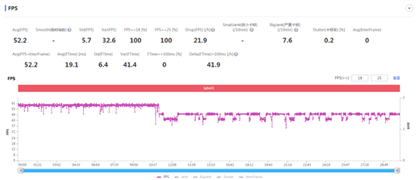 第二個(gè)測(cè)試項(xiàng)目是中特效60幀《原神》,而這一次的挑戰(zhàn),無(wú)疑是更加艱巨??梢钥闯?,在前11分鐘內(nèi),OPPO Reno8 Pro+將第一輪測(cè)試的優(yōu)秀表現(xiàn)也延續(xù)至此,幀率基本能夠維持在60幀上下波動(dòng)。而從第11分鐘開始,幀率便開始鎖50幀的上限,在個(gè)別畫面復(fù)雜、戰(zhàn)局激烈的場(chǎng)景下更是降至40幀。