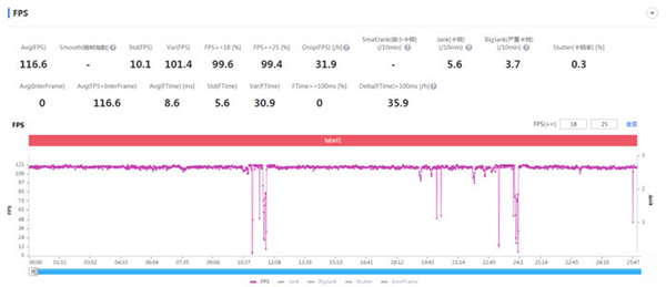 游戲低負(fù)載測試方面,我選取了國民手游《王者榮耀》,開啟最高120幀幀率。30分鐘測試下來,平均幀率116.6幀,穩(wěn)得一批。
