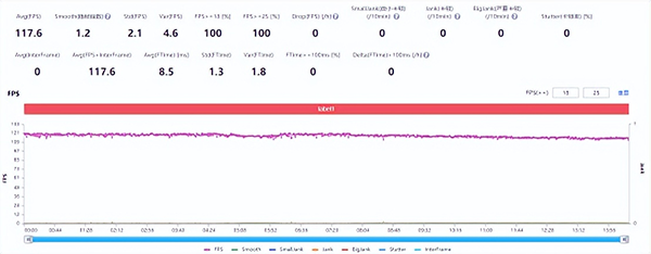 話不多說,我們直接用國民度最高的手游之一的《王者榮耀》作為測(cè)試項(xiàng)目。根據(jù)測(cè)試結(jié)果,我們可以看到,在超高幀率模式下,試玩1小時(shí)左右的游戲,OPPO Reno8 Pro+的平均幀率基本上接近滿幀的120幀。整個(gè)游戲過程中,OPPO Reno8 Pro+帶給人的感覺就是,全程幾乎沒有出現(xiàn)任何卡頓現(xiàn)象,玩起來非常絲滑順暢。