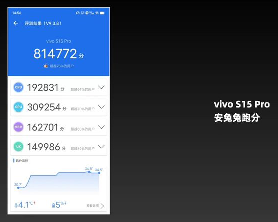 這一次的vivo S15 Pro選擇了聯(lián)發(fā)科新一代旗艦級芯片天璣8100,該芯片得益于先進的臺積電5nm工藝,與4顆2.85GHz高頻A78大核心,將性能與功耗平衡地恰到好處,成為今年口碑最好的旗艦平臺之一。實測下來,vivo S15 Pro的安兔兔V9跑分超過了81萬,較上代有相當大的提升。