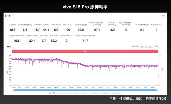 游戲方面,我們測試了最高畫質(zhì)《原神》璃月港20分鐘幀率,vivo S15 Pro在前8分鐘的表現(xiàn)非常強悍,直接跑滿60幀,隨后手機會觸發(fā)溫度保護機制,幀率逐漸穩(wěn)定在45幀左右。