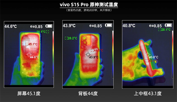25度室溫環(huán)境下,運行高畫質(zhì)原神20分鐘后的機身溫度,無論正背面都控制在了45度以內(nèi),對應其幀率表現(xiàn)而言,發(fā)熱控制算是比較不錯的。