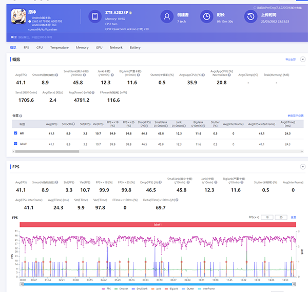 最后是原神,由于散熱一般,所以性能限制的也很死,平均幀率只有41.1FPS,對驍龍8Gen1手機來說也是見怪不怪了。