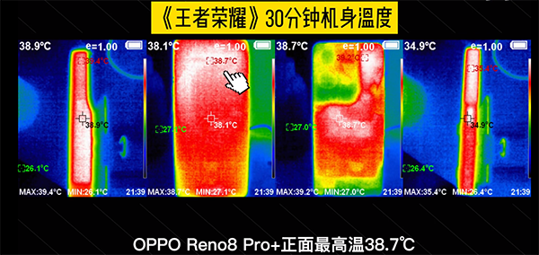 另外,在體驗《王者榮耀》手游的過程中,其優(yōu)勢也不止于穩(wěn),在溫控方面的表現(xiàn)也十分搶眼。在經(jīng)過30分鐘的高幀率+高畫質(zhì)的體驗之后,Reno8 Pro+的機(jī)身正面最高為38.7度,頂部中框最高為38.9度,基本沒有發(fā)熱的感覺,確實很優(yōu)秀。由此可見,Reno8 Pro+憑借著低功耗的天璣8100-Max以及超晶石墨散熱系統(tǒng),就算長時間的游戲體驗,機(jī)身內(nèi)部的溫度也控制地相當(dāng)?shù)轿弧?