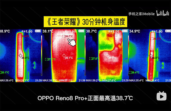 值得一提的是,在UP主做游戲?qū)崪y(cè)的過(guò)程中,可以看到Reno8 Pro+的散熱表現(xiàn)同樣可圈可點(diǎn):玩《王者榮耀》時(shí)的正面溫度最高38.7℃,背面最高39.2℃,手機(jī)兩邊的最高分別為39.4℃以及35.4℃。即便是“發(fā)熱大戶”的原神整機(jī)的最高溫也才剛剛四十出頭。由此看來(lái),Reno8 Pro+憑借著低功耗的天璣8100-Max和超晶石墨散熱系統(tǒng),對(duì)于游戲時(shí)機(jī)身內(nèi)部的發(fā)熱控制還是挺到位的。