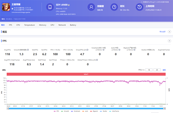 《王者榮耀》可開啟120幀+極致畫面總質(zhì)量(目前大部分手機(jī)最高只能120幀+高清畫面總質(zhì)量),本次測試在最高畫質(zhì)設(shè)置下進(jìn)行。PerfDog軟件記錄到的平均幀數(shù)為118幀,大部分時(shí)間游戲都能保持在110幀以上,流暢度非常好。幀數(shù)只有在多人激烈團(tuán)戰(zhàn)時(shí)才會(huì)有稍大一點(diǎn)的波動(dòng),不過仍舊能保持不錯(cuò)的流暢度。