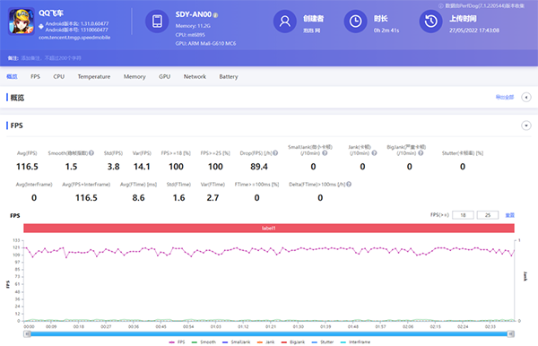《QQ飛車》也支持120幀模式,畫面特效全開。根據(jù)PerfDog軟件記錄結(jié)果,游戲平均幀數(shù)為116.5幀,游戲全程都能保持很流暢的畫面,流暢度方面不用擔(dān)心。