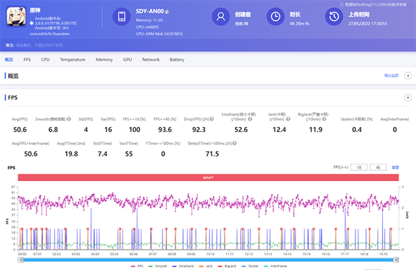 在對游戲要求極高《原神》游戲測試中,采用極高+60幀畫質(zhì)組合,在負(fù)載比較高的璃月港游戲場景進(jìn)行跑圖測試。20分鐘后,PerfDog軟件記錄到的平均幀數(shù)為50.6幀,有93.6%的時(shí)間里幀數(shù)都不低于45幀。雖然偶爾會(huì)出現(xiàn)一點(diǎn)小卡頓,但整體能夠提供不錯(cuò)的畫面流暢度。
