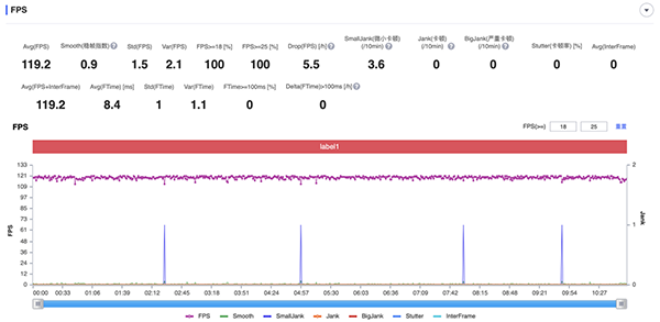 不過(guò)還是要看榮耀具體的調(diào)校,用幀率測(cè)試軟件測(cè)試了《王者榮耀》,最高畫(huà)質(zhì),120Hz,12分鐘下來(lái),平均幀率在119.2幀,這波成績(jī)算是調(diào)校比較到位。