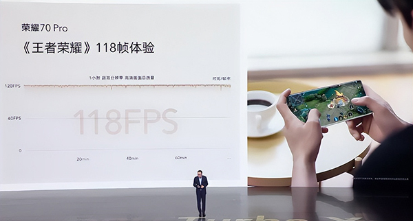在《王者榮耀》游戲中,榮耀70 Pro設(shè)定超高分辨率和高清畫質(zhì),1小時(shí)的游戲全程流暢穩(wěn)定,實(shí)測(cè)平均幀率為118幀,并且整體表現(xiàn)十分平穩(wěn)只在結(jié)束時(shí)稍微有完全可以忽略的小小波動(dòng)。