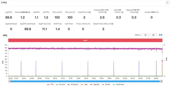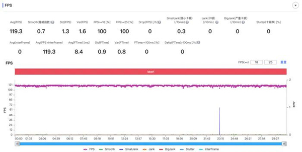 我們在26度室溫下,測得它在120幀王者榮耀的平均幀率竟高達119.3幀,要知道,高幀率的游戲畫面帶給處理器負載可是非同小可的,它一秒就要渲染120次游戲畫面,這樣的壓力容易使圖形性能不夠的手機出現(xiàn)卡頓掉幀的情況,如此一來,游戲體驗也就無從談起。