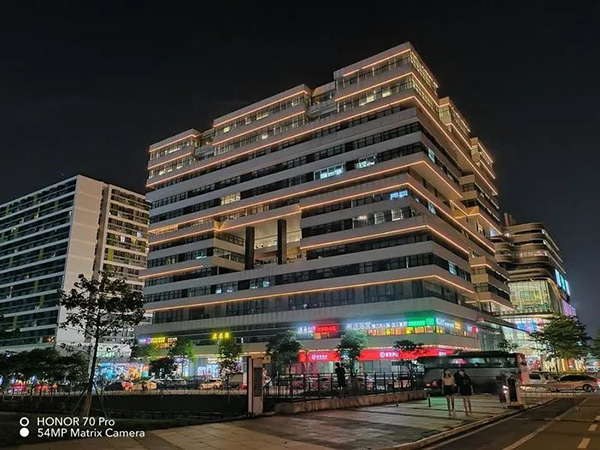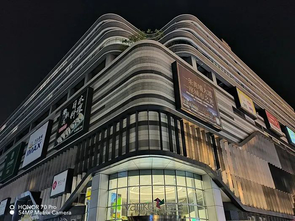 在夜景拍攝中,榮耀70 Pro的高光壓制是比較克制的,整個畫面的曝光策略是偏暗的,在保留影調(diào)的同時用HDR算法壓低高光,雖然說他的高光壓制并沒有一些產(chǎn)品出色,但是他的影調(diào)是更加接近于人眼所見的,與此同時,這樣的曝光策略也能讓他更好還原出天空的色彩。